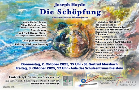 Als Großchorprojekt mit über 100 Chormitgliedern erklingt Haydns berühmtes Oratorium in einer besonderen Fassung mit Solisten, Kammermusikensemble und Klavier zu vier Händen unter der Leitung von Dirk van Betteray am Donnerstag, 02. Oktober um 19 Uhr in St. Gertrud Morsbach und am Freitag, 03. Oktober um 17 Uhr in der Aula des Schulzentrums Bielstein. Karten zum Preis von 25€ (Schüler und Studenten 10€) sowie in Morsbach zusätzlich reine Hörplätze auf den Seitenemporen zu 15€, ermäßigt 5€ sind ab 01. September im Pastoralbüro Morsbach (Tel.: 02294-238) sowie im Musikschulbüro der Musikschule der Homburgischen Gemeinden in Wiehl (Tel.: 02262-99260) und bei den Chormitgliedern erhältlich.