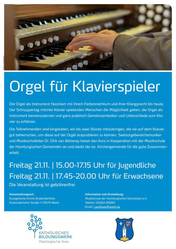 Lust zu musizieren? Dann steigen Sie jetzt nach den Sommerferien ein! Die Angebote der Musikschule richten sich an Kinder, Jugendliche und Erwachsene gleichermaßen. Die Musikschule bietet neben Musikalischer Früherziehung für die Jüngsten Unterricht für Anfänger und Fortgeschrittene in sehr vielen instrumentalen Fächern und Gesang an. Die Ensembles und Chöre der Musikschule sind offen für alle Musikbegeisterten, nicht nur für Schülerinnen und Schüler der Musikschule. Das gilt auch für die Wiehler Chorakademie mit ihrem Knaben- und Mädchenchor. Selbstverständlich sind für alle Angebote unverbindliche und kostenfreie Probestunden möglich oder es kann bestehender Unterricht besucht werden, um den Unterricht und die Lehrkraft kennenzulernen. Interessenten können sich auf der Homepage der Musikschule unter www.mdhg.de genauer über das Angebot und die Lehrkräfte informieren oder sich direkt an die Geschäftsstelle der Musikschule wenden: