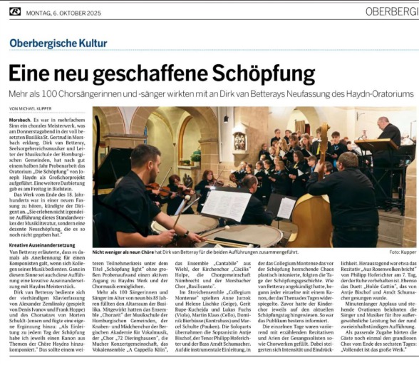 Die Ausführenden des musikalischen Großprojekts in Lichtenberg waren im Einzelnen: Antje Bischof (Sopran), Dirk Schmitz (Tenor), Arndt Schumacher (Bariton), Michael Bischof und Frank Hoppe (Klavier), Lukas Schumacher (Leitung Schlagwerkgruppe), Knaben- und Mädchenchor der Bergischen Akademie für Vokalmusik, Kirchenchor „Cäcilia“ Holpe, Vokalensemble A CAPPELLA Köln, ensemble cantabile wiehl, CHORZEIT der Musikschule der Homburgischen Gemeinden, Chor ´72 Dieringhausen und die Mucher Konzertgemeinschaft. Dem Knaben- und Mädchenchor verschaffe die Aufführung, so van Betteray, nach langer Coronapause endlich wieder die Möglichkeit Konzerterfahrungen bei einem Großprojekt zu sammeln.
